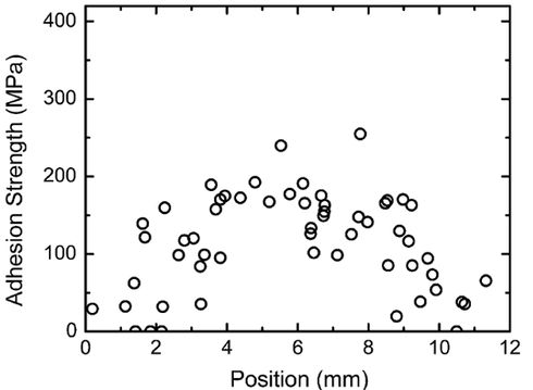 Measuring adhesion of cold spray coatings to substrates, or the cohesive strength within a coating is difficult and requires spraying significant amounts of powder. We developed a technique known as "splat adhesion testing" that can measure adhesive properties for a single cold sprayed particle on a substrate. This technique has been applied to metal-metal and metal-ceramic interfaces. The "splat adhesion strength" measured from this technique has been correlated to degree of recrystallization at metal-metal interfaces and nanoscale chemical reactions at metal-ceramic interfaces.